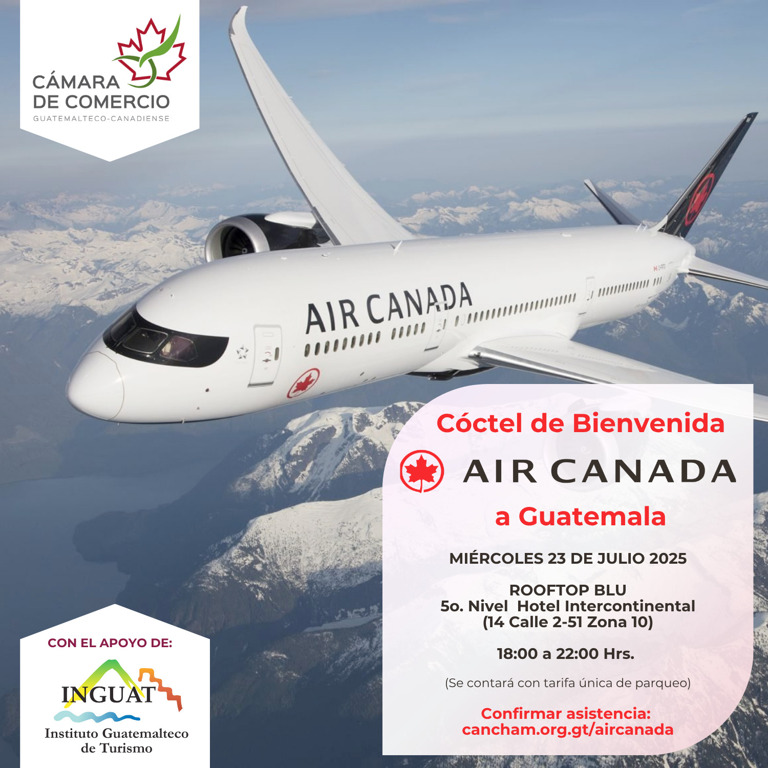 CANCHAM le invita a celebrar juntos la llegada de Air Canada a Guatemala. Networking, brindis y oportunidades de negocios.